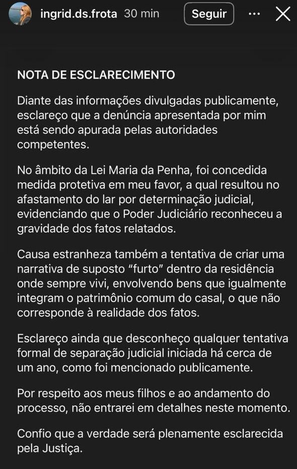 Após a repercussão e pronunciamento do parlamentar, Ingrid Frota utilizou as redes sociais para publicar uma nota de esclarecimento. De acordo com ela, no âmbito da Lei Maria da Penha, lhe foi concedida medida protetiva, que resultou no afastamento do lar por determinação judicial.