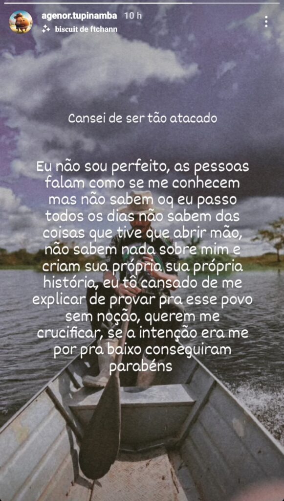 “Cansei de ser tão atacado. Eu não sou perfeito, as pessoas falam como se me conhecessem, mas não sabem o que eu passo todos os dias, não sabem das coisas que tive que abrir mão, não sabem nada sobre mim e criam sua própria história, eu estou cansado de me explicar de provar para esse povo sem noção, querem me crucificar, se a intenção era me pôr para baixo conseguiram, parabéns”, escreveu Agenor.
