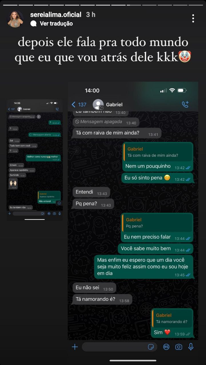 A influenciadora Sereia Lima expôs nesta quinta-feira (23), em Manaus, um print de uma conversa com um de seus namorados e desabafou: “Depois ele fala para todo mundo que eu que vou atrás dele”.