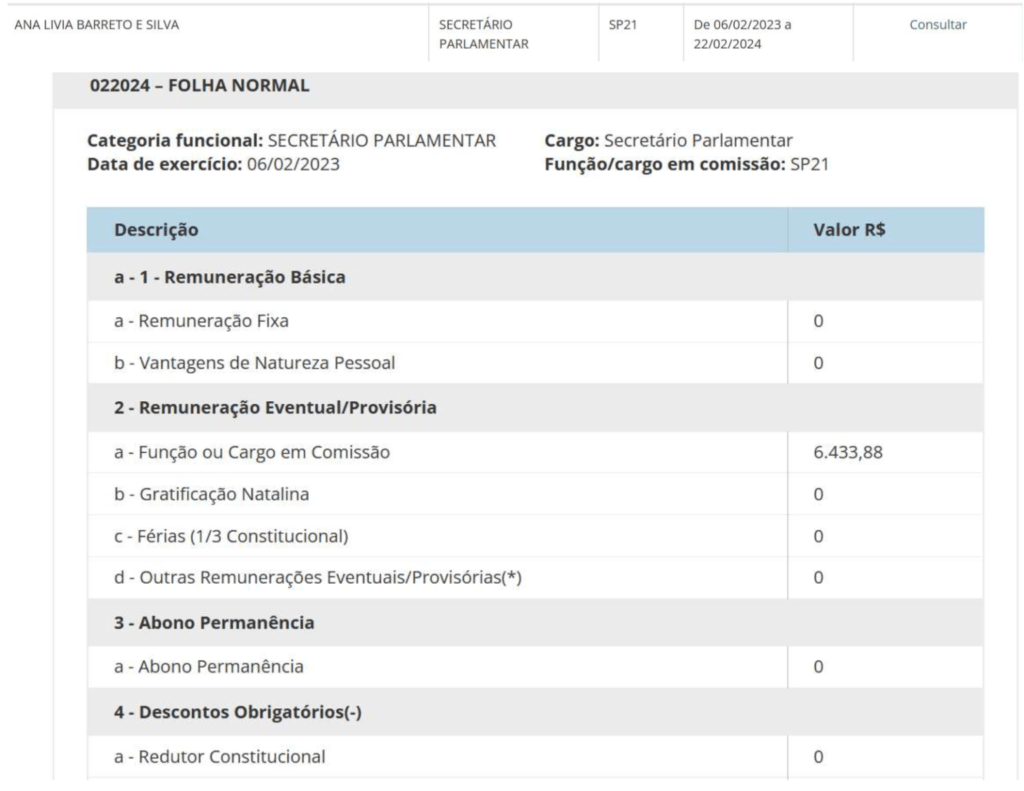 Já quando Mandel foi eleito deputado federal, ela passou a atuar como secretária parlamentar (SP21) de fevereiro de 2023 a fevereiro deste ano, com remuneração de R$ 6.433,88.