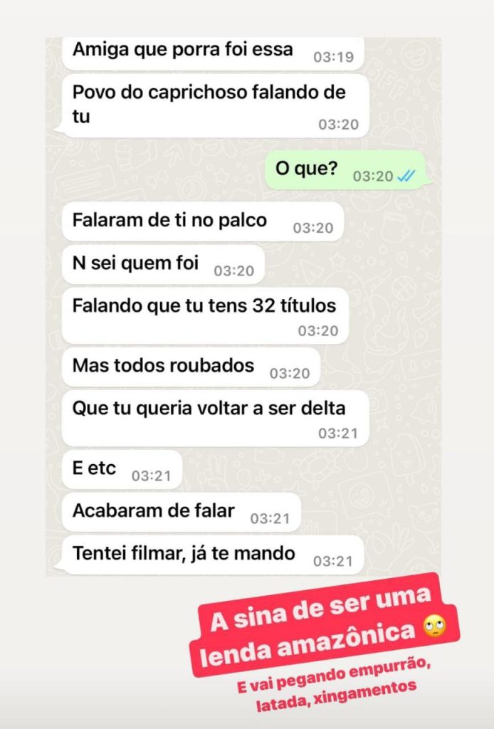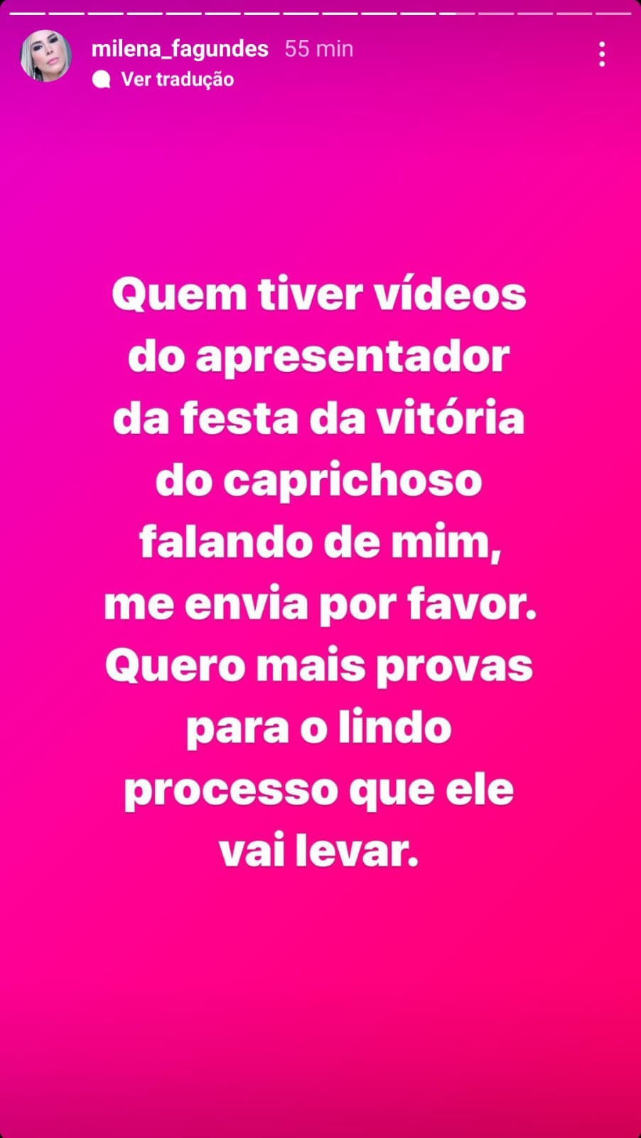 O apresentador da festa de comemoração do Caprichoso também teria citado o nome de Milena com afirmações injuriosas. A ex-BBB pediu o nome dele em suas redes e afirmou que irá processá-lo.