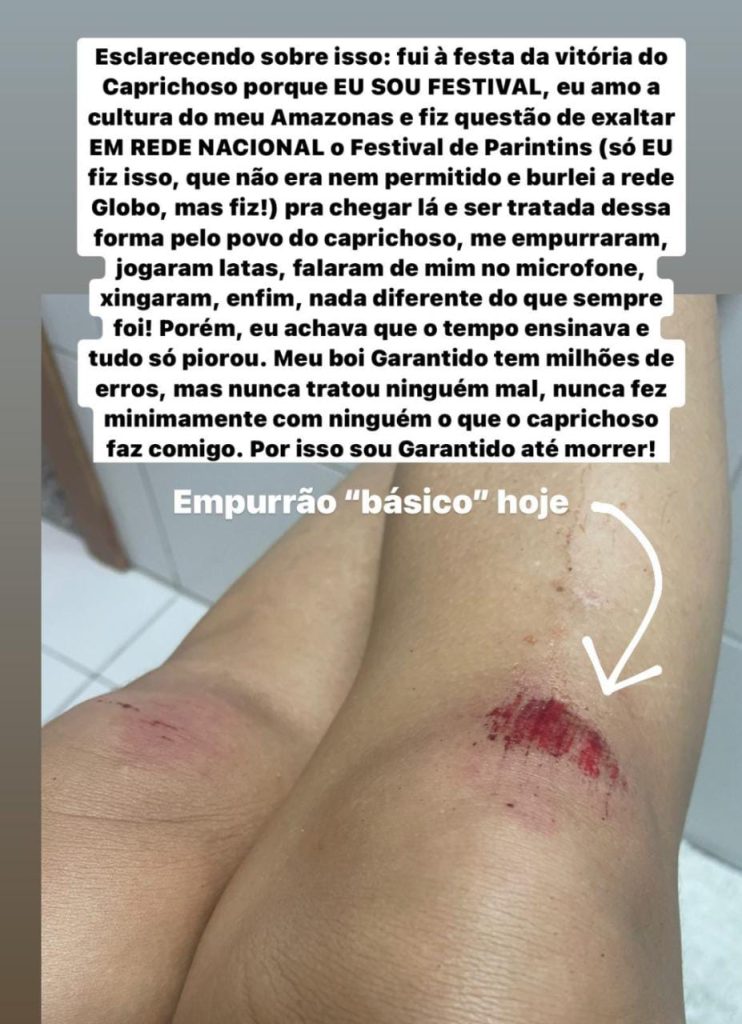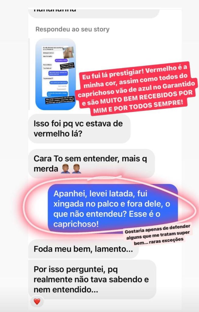 “Eu achava que o tempo ensinava e tudo só piorou. Meu boi Garantido tem milhões de erros, mas nunca tratou ninguém mal, nunca fez minimamente com ninguém o que o Caprichoso faz comigo. Por isso sou Garantido até morrer!”, escreveu Milena.