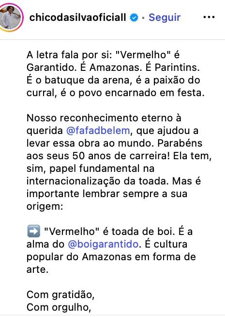 O próprio autor da toada, Chico da Silva, se manifestou sobre a polêmica: “A letra fala por si: ‘Vermelho’ é Garantido. É Amazonas. É Parintins. É o batuque da arena, é a paixão do curral, é o povo encarnado na festa”, enfatizou Chico que também aproveitou a oportunidade para agradecer Fafá de Belém que ajudou a dar visibilidade a toada.