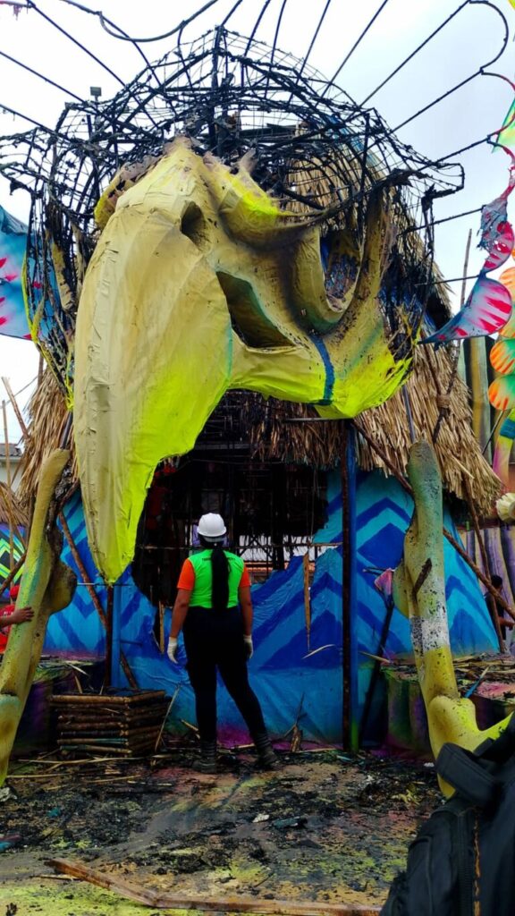 Por volta das 10h55, uma parte de um módulo alegórico, que estava sendo finalizado para o Festival Folclórico, começou a pegar fogo, gerando muita fumaça e mobilizando as equipes do boi.