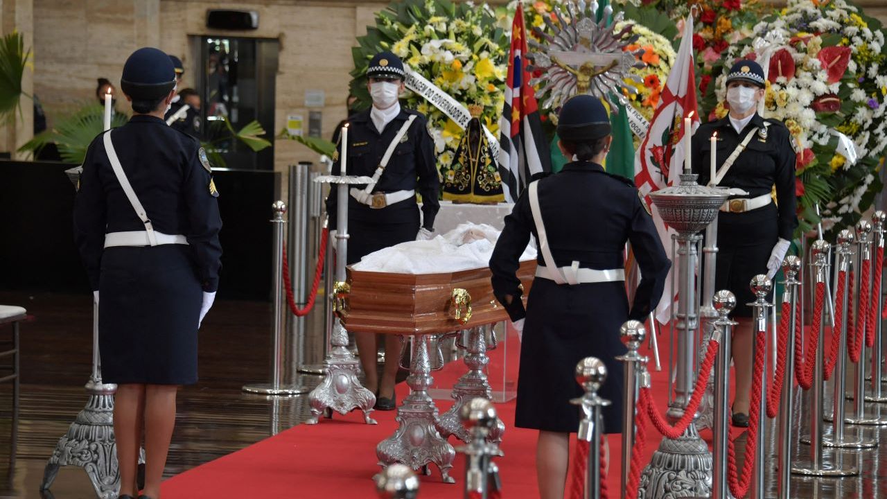 O corpo do prefeito chegou à prefeitura carregado por agentes da Guarda Civil Metropolitana por volta das 13h15. A entrada foi restrita a familiares e amigos mais próximos, por causa da pandemia de Covid-19.