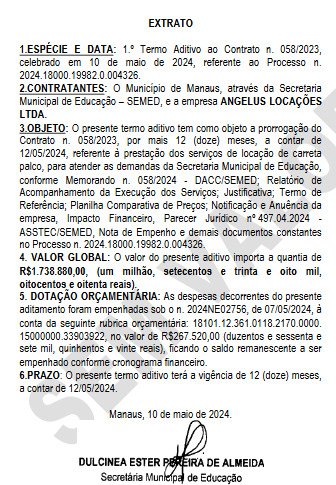 O 1º Termo de Aditivo foi assinado por Dulcinea Almeida e publicado no Diário Oficial do Município (DOM) no dia 29 de maio de 2024. Conforme o documento, a renovação de contrato terá vigência de 12 meses, a contar do dia 12 de maio.