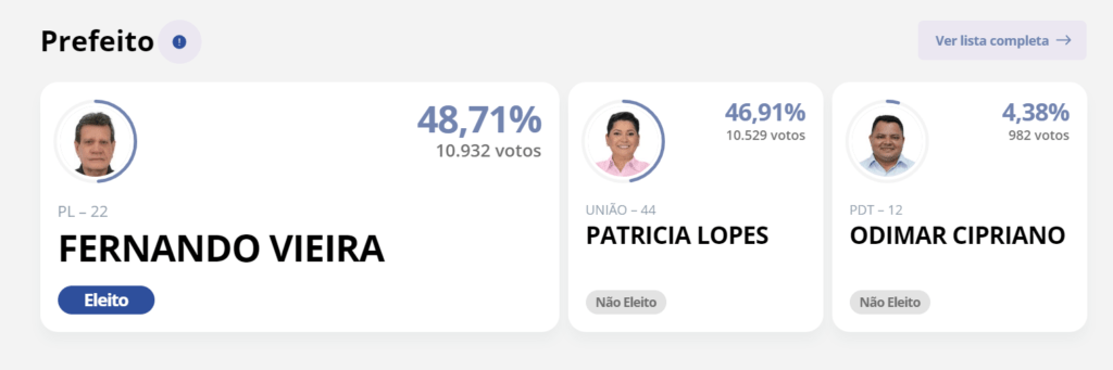 A atual prefeita, Patrícia Lopes (União Brasil), obteve 10.529 votos (46,91%), havendo uma diferença de 407 votos do prefeito eleito.