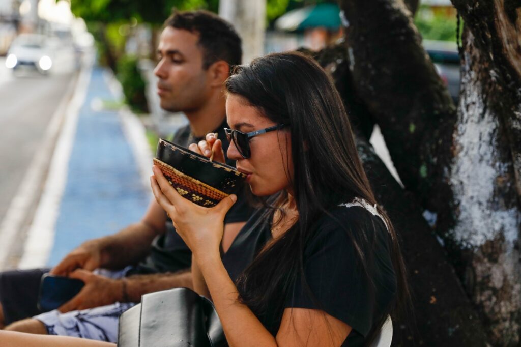 “O tacacá dá uma ardência, porque tem o jambu. Tem gente que não conhece e diz que a boca fica tremendo, mas eu acalmo dizendo que é normal”, brinca a dona de uma banca de tacacá, Martha Oliva.