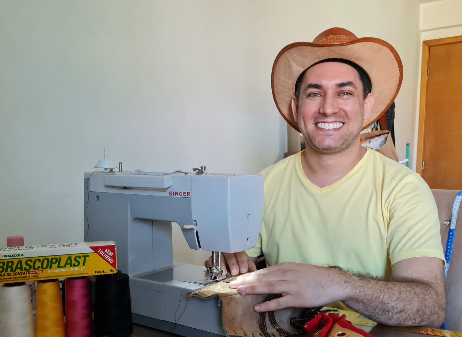 “O rio São Francisco faz divisa entre duas cidades, que é Petrolina (PE) e Juazeiro (BA), e foi com base nessa divisão que eu trabalhei na roupa do Lampião e da Maria bonita, para fazer dois tipos de desenhos, separados, e que se encaixam através das cores. Nessa parte de fantasias, indumentárias, a gente é responsável por levar essas novidades, como foi a do brilho que não existia, como foi a das botas, das perneiras, que eu tenho orgulho de ser a pessoa que iniciou as perneiras em quase todos do bando. E muita gente tem me procurado para falar e para querer também essas perneiras”, comemorou.