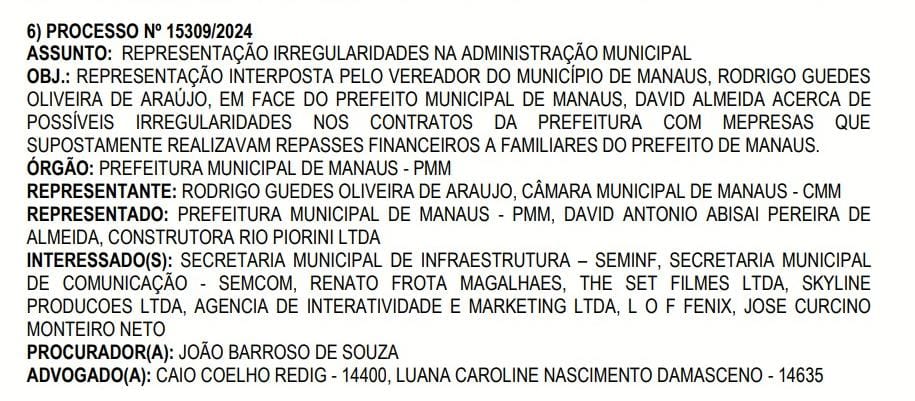 O Tribunal de Contas do Amazonas (TCE-AM) colocou em pauta a representação de relatoria do conselheiro Júlio Assis Corrêa Pinheiro, que aponta supostas irregularidades em contratos firmados pela Prefeitura de Manaus com empresas que teriam repassado recursos a aliados e familiares do prefeito David Almeida (Avante), entre elas sua sogra, Lidiane Fontenelle. A iniciativa foi movida pelo vereador Rodrigo Guedes (Podemos), e publicada no Diário Oficial do TCE-AM dessa terça-feira (7).