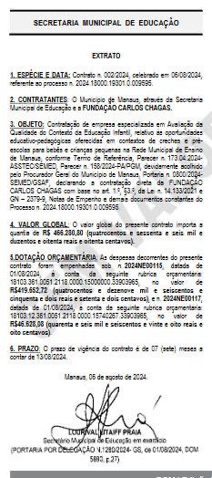 De acordo com o extrato de contrato publicado na edição do Diário Oficial do Município (DOM) da última sexta-feira (13/09), a Semed informou que o serviço é para “contratação de empresa especializada em Avaliação da Qualidade do Contexto da Educação Infantil, relativo às oportunidades educativo-pedagógicas oferecidas em contextos de creches e pré-escolas para bebês e crianças pequenas na Rede Municipal de Ensino de Manaus”.