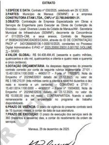 A gestão municipal de David Almeida, iniciou o ano com gastos elevados na Secretaria Municipal de Infraestrutura (Seminf), conforme contratos e termos aditivos publicados no Diário Oficial do Município (DOM) nas últimas duas semanas. Os investimentos já somam R$ 92,4 milhões e concentram-se, principalmente, em obras de engenharia, usinagem de concreto e locação de máquinas, em meio à críticas recorrentes sobre a precariedade da malha viária da capital.