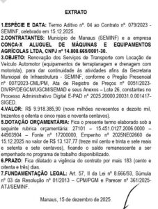 O terceiro aditivo que envolve a Seminf é com a empresa Conca-X Aluguel de Máquinas e Equipamentos Agrícolas Ltda. O contrato prevê renovação dos serviços de transporte com locação de veículo automotor (equipamentos de terraplanagem e drenagem com motorista). O custo extra para os cofres do município será de R$ 9,9 milhões, com prazo de duração de 183 dias.