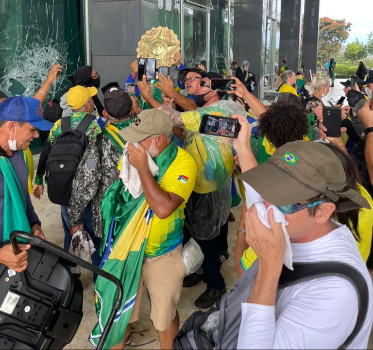 O grupo conseguiu invadir os prédios sedes do Três Poderes após entrar em confronto com a Polícia Militar na Esplanada dos Ministérios, em Brasília. Os participantes de atos antidemocráticos estavam com pedaços de paus e pedras.