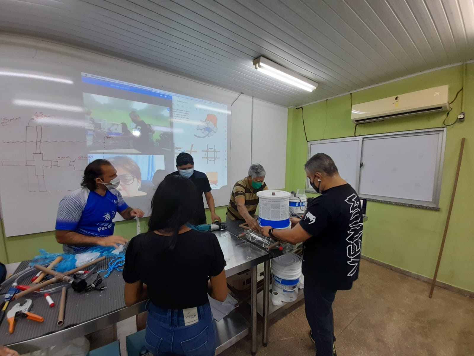 Também foi disponibilizado um sistema “ligar e usar” (em inglês plug and play) com 18 aquários em um sistema de recirculação de água, como minissistema de aquaponia ornamental no Ifam. Foram realizadas, ainda, aulas práticas de construção de aquapiso (aquários fabricados com cerâmica e vidro) de baixo custo e minissistema de recirculação de água, bem como operacionalização e manutenção.