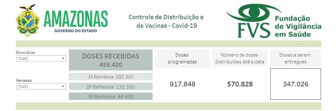 Na primeira remessa do Ministério da Saúde, o Amazonas recebeu 282.320 doses da Coronavac. No dia 23, outras 132,5 mil doses da AstraZeneca desembarcaram no Estado. No dia 25, o Amazonas recebeu 44.600 doses da Coronavac. Ao todo, o Amazonas já conta com 459 mil doses de imunizantes.