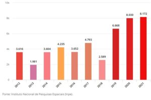 O Amazonas bateu recorde histórico de queimadas no mês de agosto de 2021. Esse foi o terceiro ano consecutivo que o recorde para o mês foi superado. Nos primeiros 26 dias deste mês, foram registrados 8.172 focos de incêndios. No ano passado, agosto registrou 8.030 focos de incêndios. Em 2019, foram 6.668 registros.