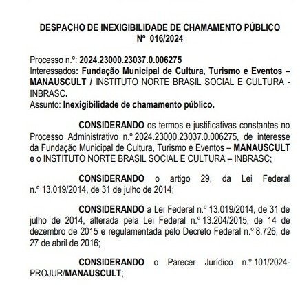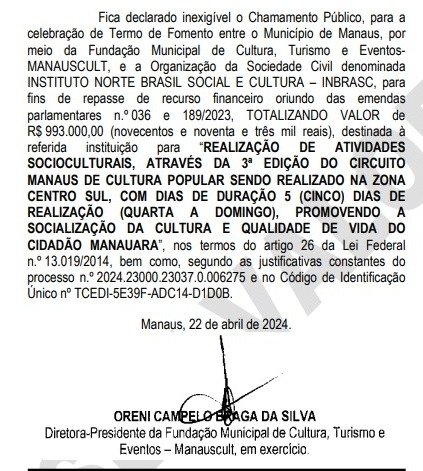 Já no DOM da segunda-feira (22), a prefeitura divulgou uma dispensa de licitação de R$ 993 mil para a Inbrasc. O valor também é referente a emendas parlamentares. O Termo de Fomento foi celebrado pela Fundação Municipal de Cultura, Turismo e Eventos (Manauscult) e o instituto.