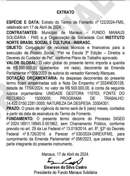 No DOM da quinta-feira (18), a prefeitura divulgou extrato do Termo de Fomento nº 122/2024, firmado entre o Executivo Municipal e o instituto, cujo objeto é a execução do projeto social “Pet na Escola 3ª Edição – Direitos e Deveres do Cuidador de Pet”.