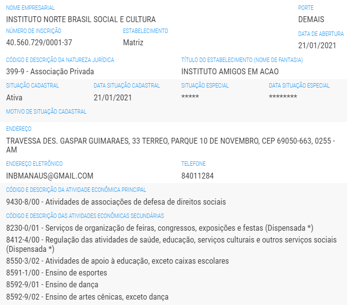 O Instituto Norte Brasil Social e Cultura, inscrito sob o CNPJ 40.560.729/0001-37, fica localizada na rua Comendador Clementino, 409, bairro Centro.