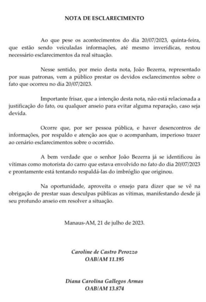 redes sociais sobre o acidente. “Eu não tive a intenção de causar essa confusão toda”, diz o comunicado assinado por advogados.