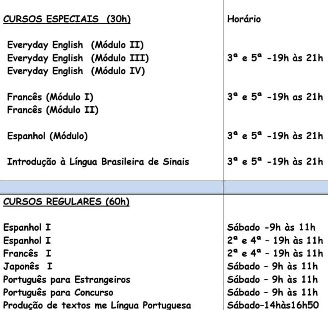 Os cursos disponíveis no período 2022/1 (edital 002/2022) são ofertados de forma on-line, bem como as inscrições devem ser feitas pela internet. As aulas iniciam a partir do dia 08 de março de 2022. Confira as vagas disponíveis: