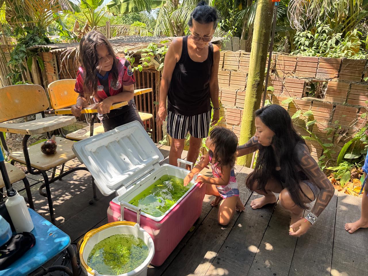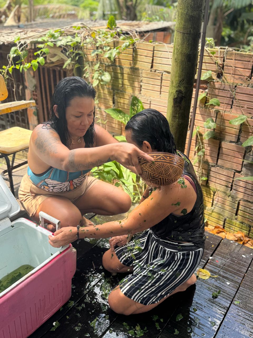 Dona Leia explicou que, no banho, foram usadas folhas de alho-bravo, limão, pinhão-roxo e mucuracaá, deixadas na água de um dia para o outro, absorvendo também o sereno da noite — elemento essencial na tradição e nos saberes indígenas. Antes dos banhos, cânticos foram entoados. “Nosso povo fala que o canto esfria nosso coração, mas também esfria o coração da Terra. A nossa música tem esse poder de nos conectar com o coração da Terra”, comentou Vanda.
