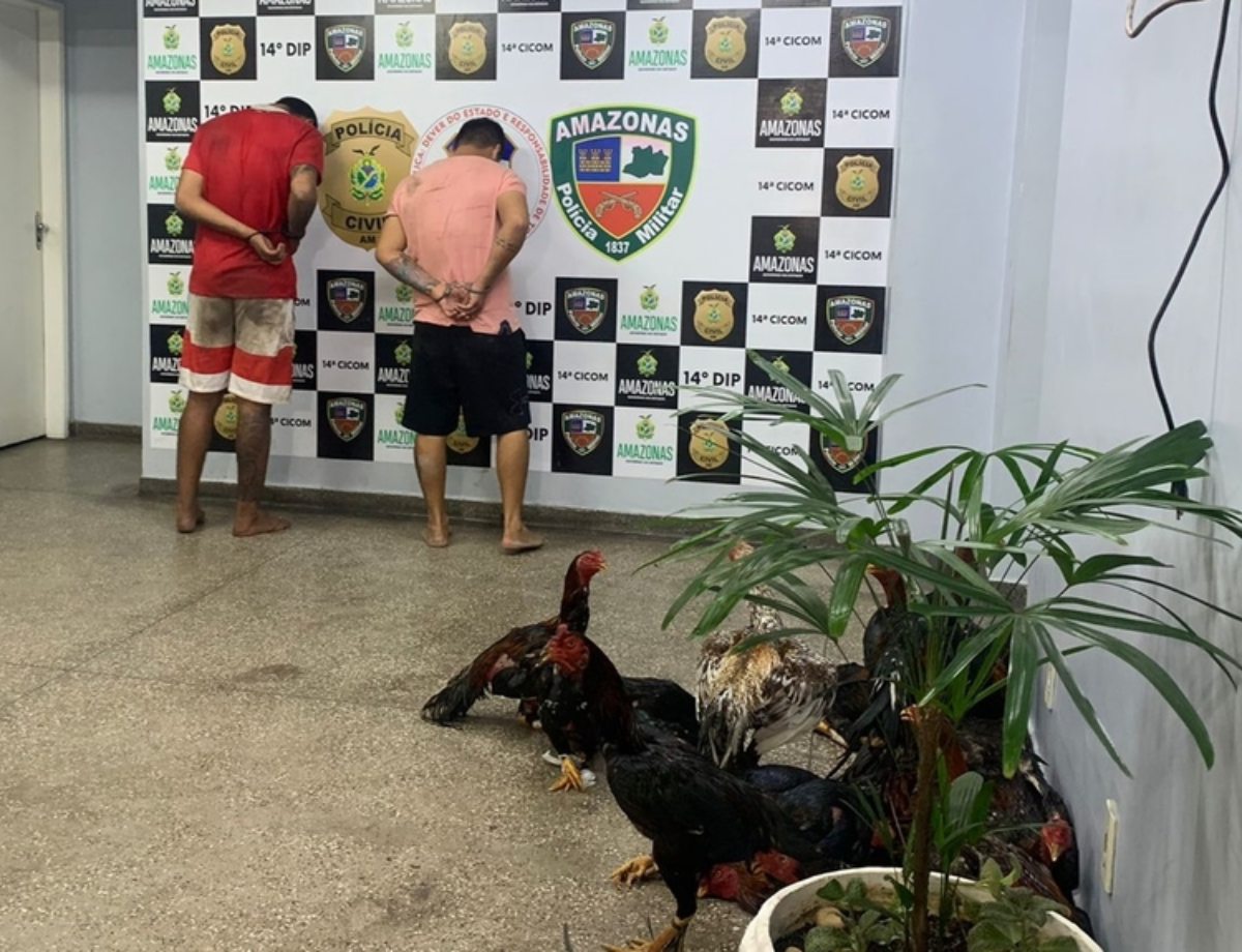 Dois indivíduos, que não tiveram as identidades divulgadas, foram presos nessa segunda-feira (23), suspeitos de organizarem rinha de galo em um sítio no Ramal 2000, próximo ao Ramal do Brasileirinho, localizado zona Leste de Manaus.