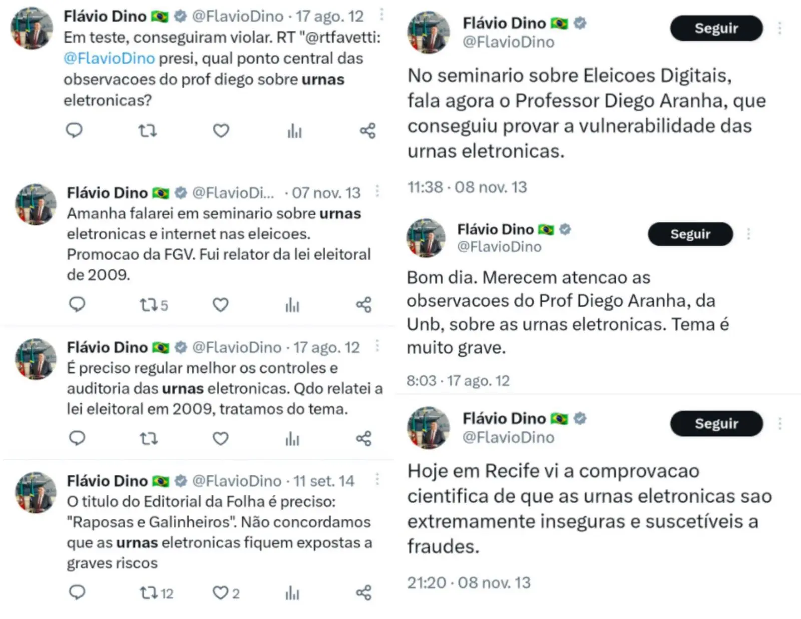 Os usuários das redes sociais recuperaram publicações do ministro da Justiça Flávio Dino afirmando que as urnas eletrônicas são “extremamente inseguras” e “suscetíveis a fraudes”. As falas ocorreram em 2013: “Não concordamos que as urnas eletrônicas fiquem expostas a graves riscos”, disse em outro post.