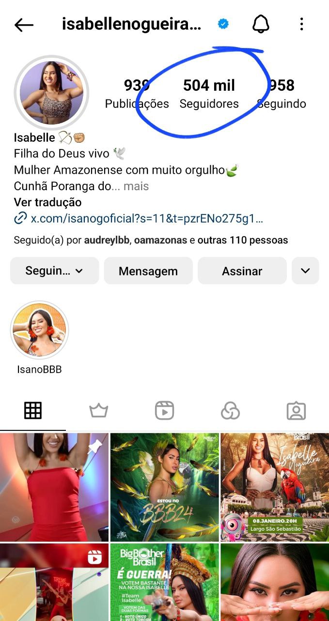 A cunhã-poranga do Boi Garantido, a amazonense Isabelle Nogueira, atingiu nesta terça-feira (9), a marca de 500 mil seguidores no Instagram em menos de 24 horas após entrar no Big Brother Brasil (BBB 24).