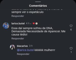 Em uma publicação nas redes que exaltava a importância de Isabelle para a divulgação do Festival de Parintins, Larice comentou: “Essa daí sempre sofreu de DNA: demasiada necessidade de aparecer. Me dá tédio”.