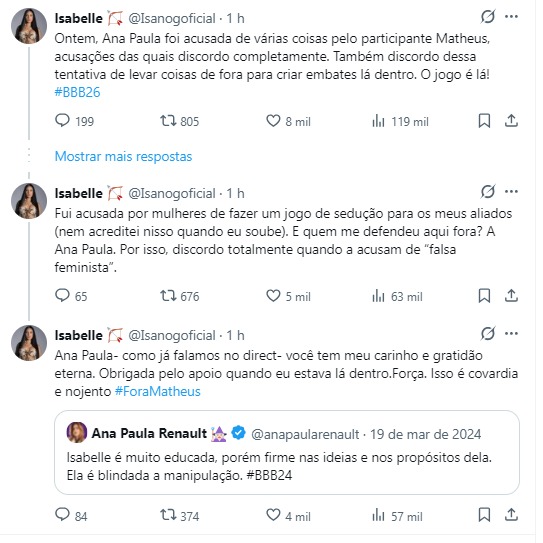 Ao se posicionar, Isabelle relembrou o apoio que recebeu de Ana Paula durante o BBB 24 e saiu em defesa da jornalista.“Você tem meu carinho e gratidão eterna. Obrigada pelo apoio quando eu estava lá dentro. Força. Isso é covardia e nojento #ForaMatheus”, escreveu.