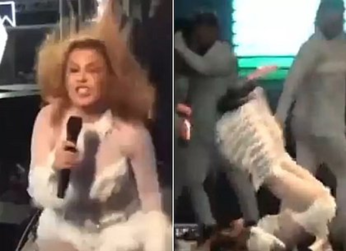 Nos vídeos que circulam nas redes sociais, é possível ver Joelma caindo de bumbum no chão, ficando com as pernas para cima enquanto cantava um dos seus hits, ‘Anjo’. Os fãs ficaram preocupados com a cantora, mas não muito tempo depois, os dançarinos que estavam no palco também caíram.