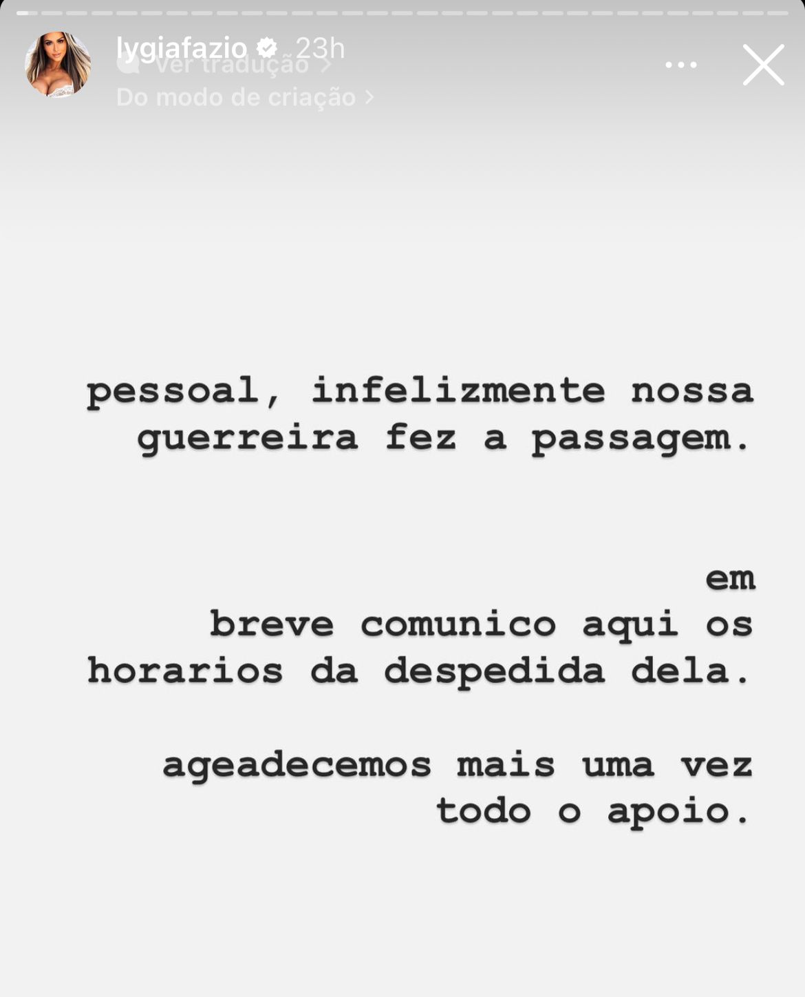 “Infelizmente nossa guerreira fez a passagem. Agradecemos mais uma vez todo o apoio”, escreveu o irmão de Lygia nas redes sociais da modelo.