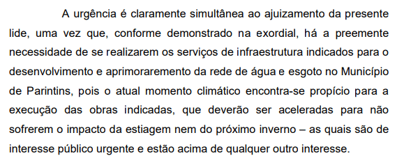 A Justiça argumentou que “a urgência é claramente simultânea” ao ajuizamento da ação, porque “há necessidade de se realizarem os serviços de infraestrutura indicados para o desenvolvimento e aprimoramento da rede de água e esgoto no município”.