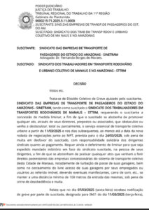 A Justiça do Trabalho da 11ª Região (AM/RR) concedeu liminar proibindo a greve dos rodoviários contra a “operação sem cobradores” em Manaus. A decisão, assinada pelo desembargador Lairto José Veloso, atendeu ao pedido do Sindicato das Empresas de Transporte de Passageiros do Amazonas (Sinetram), que alegou a ilegalidade do movimento por ainda haver mediação em andamento no Ministério Público do Trabalho (MPT). Em caso de descumprimento, o Sindicato dos Trabalhadores em Transportes Rodoviários e Urbano Coletivo de Manaus e no Amazonas (STTRM) poderá ser multado em R$ 50 mil por hora de paralisação.