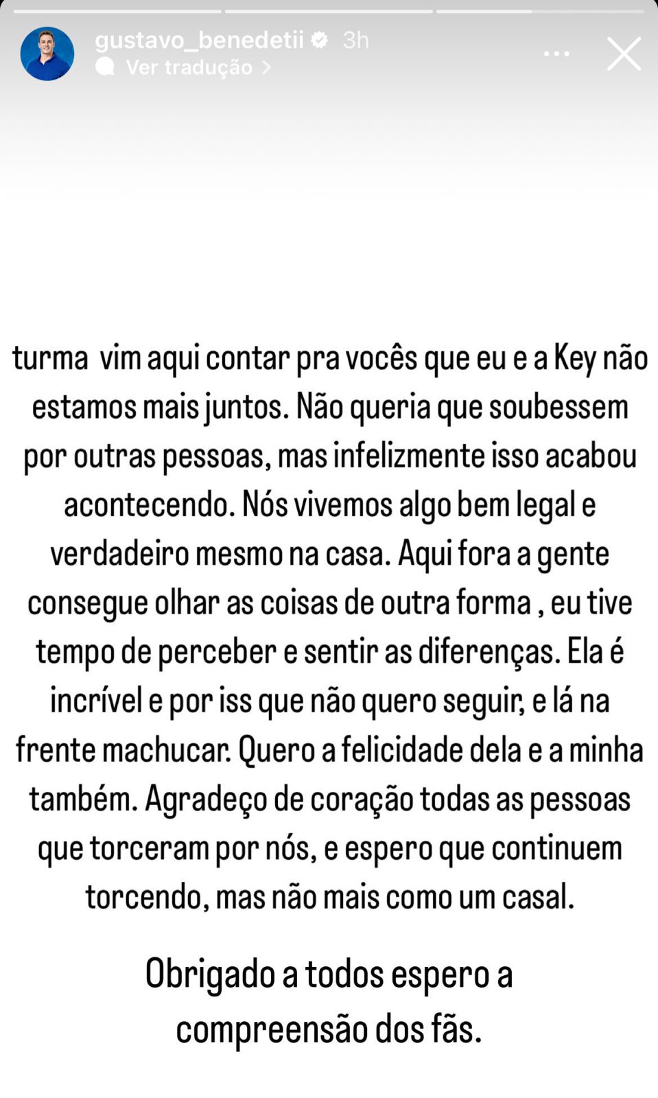 Gustavo também usou as redes sociais para falar do fim do namoro e também não deu muitos detalhes aos seus seguidores.