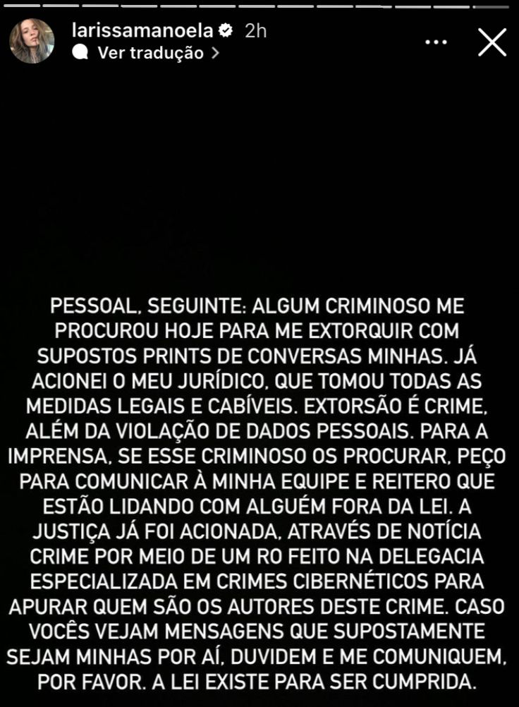 “A justiça já foi acionada, através de notícia crime por meio de um RO feito na delegacia especializada em crimes cibernéticos para apurar quem são os autores deste crime. Caso vocês vejam mensagens que supostamente sejam minhas por aí, duvidem e me comuniquem, por favor. A lei existe para ser cumprida!”, concluiu Larissa em seus stories.