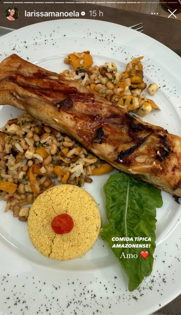 Além disso, Larissa Manoela compartilhou a foto de um prato com Tambaqui e afirmou amar a culinária amazonense.