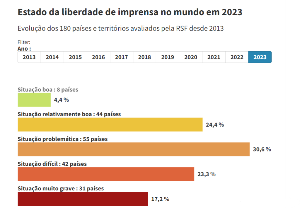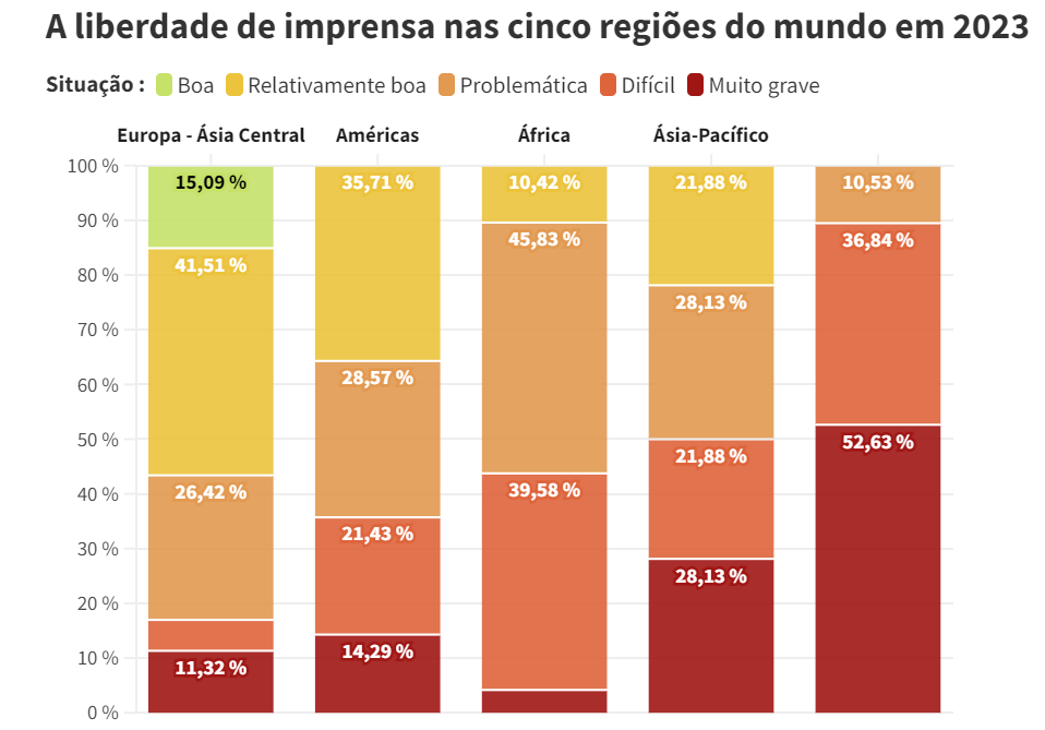 O levantamento indica que a situação é “muito grave” em 31 países, “difícil” em 42 e “problemática” em 55, sendo “boa” ou “relativamente boa” em 52 países. Com isso, as condições para o exercício do jornalismo são ruins em sete de cada 10 países e satisfatórias em apenas três de cada 10 países.