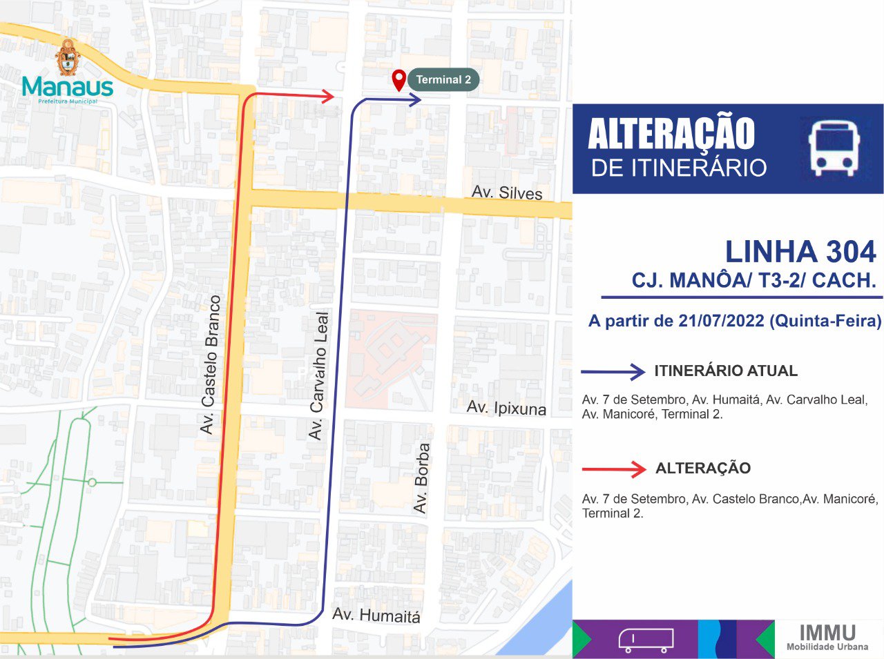 A partir da próxima quinta-feira (21/07), a linha de ônibus 304 (conjunto Manoa/T3/T2/Cachoeirinha) terá parte do itinerário alterado no bairro Cachoeirinha, zona Sul, para atender usuários do transporte público que transitam na avenida Castelo Branco.
