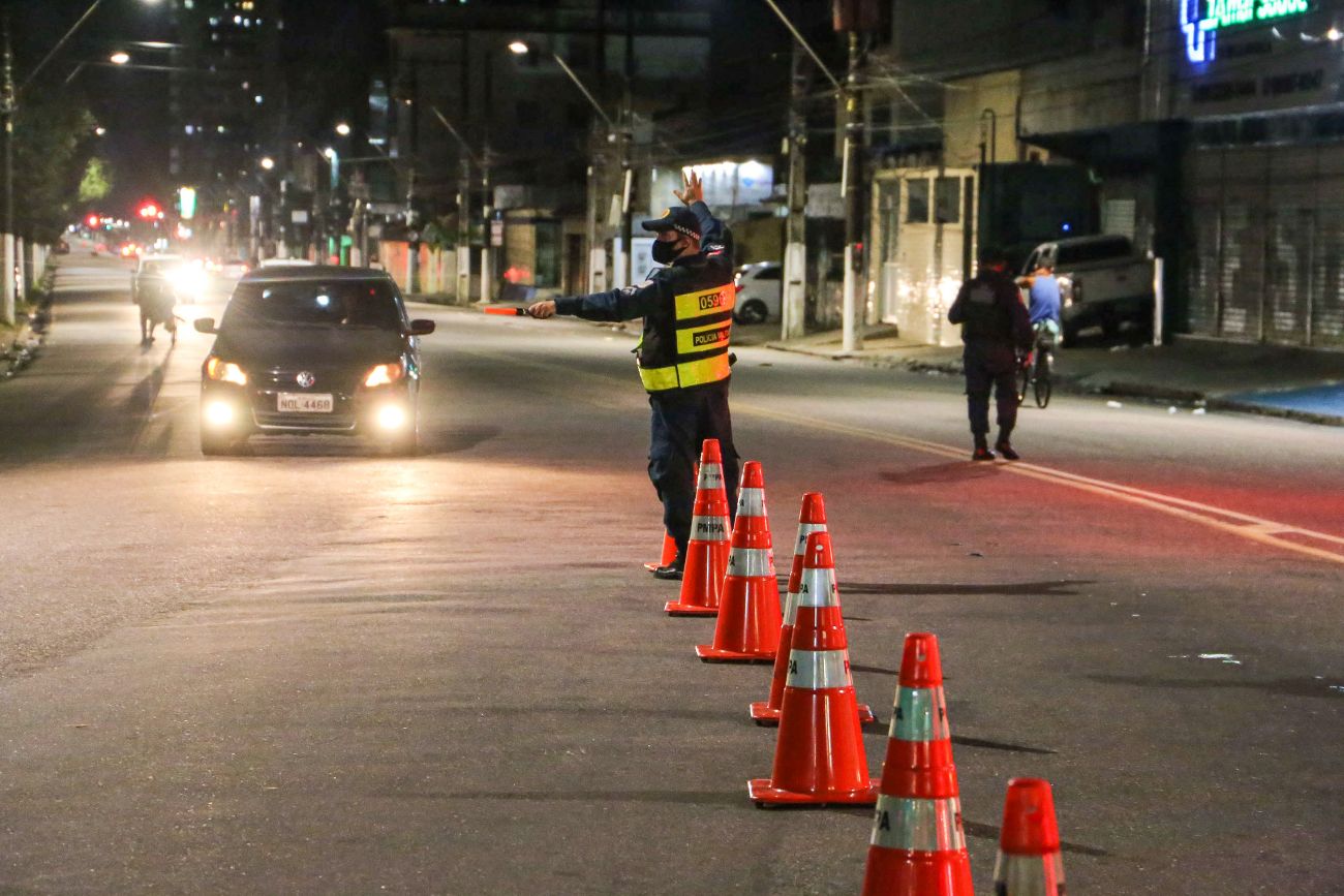 Pontualmente, às 21h dessa segunda-feira (15), iniciou a fiscalização do cumprimento das normas previstas no Decreto 800/2020, publicado no Diário Oficial do Estado (DOE), que instituiu lockdown por sete dias em cinco municípios da Região Metropolitana de Belém (RMB). A medida visa reduzir os casos de Covid-19 na região, que enfrenta um avanço da doença e forte pressão sobre as redes pública e particular de saúde, com um índice de transmissão do novo coronavírus muito alto, o mais grave desde o início da pandemia.