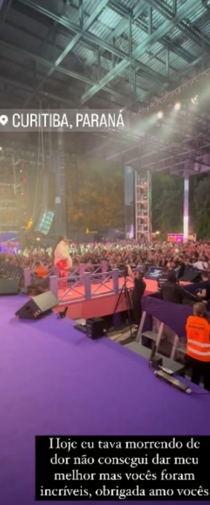 Por meio dos Stories do Instagram, a artista relatou que começou a sentir fortes dores ainda no palco e após o fim do show, foi encaminhada para o Hospital Santa Cruz. “Galera, saí do palco direto para o hospital aqui em Curitiba. Graças a Deus, não é nada grave”, iniciou ela, na legenda.