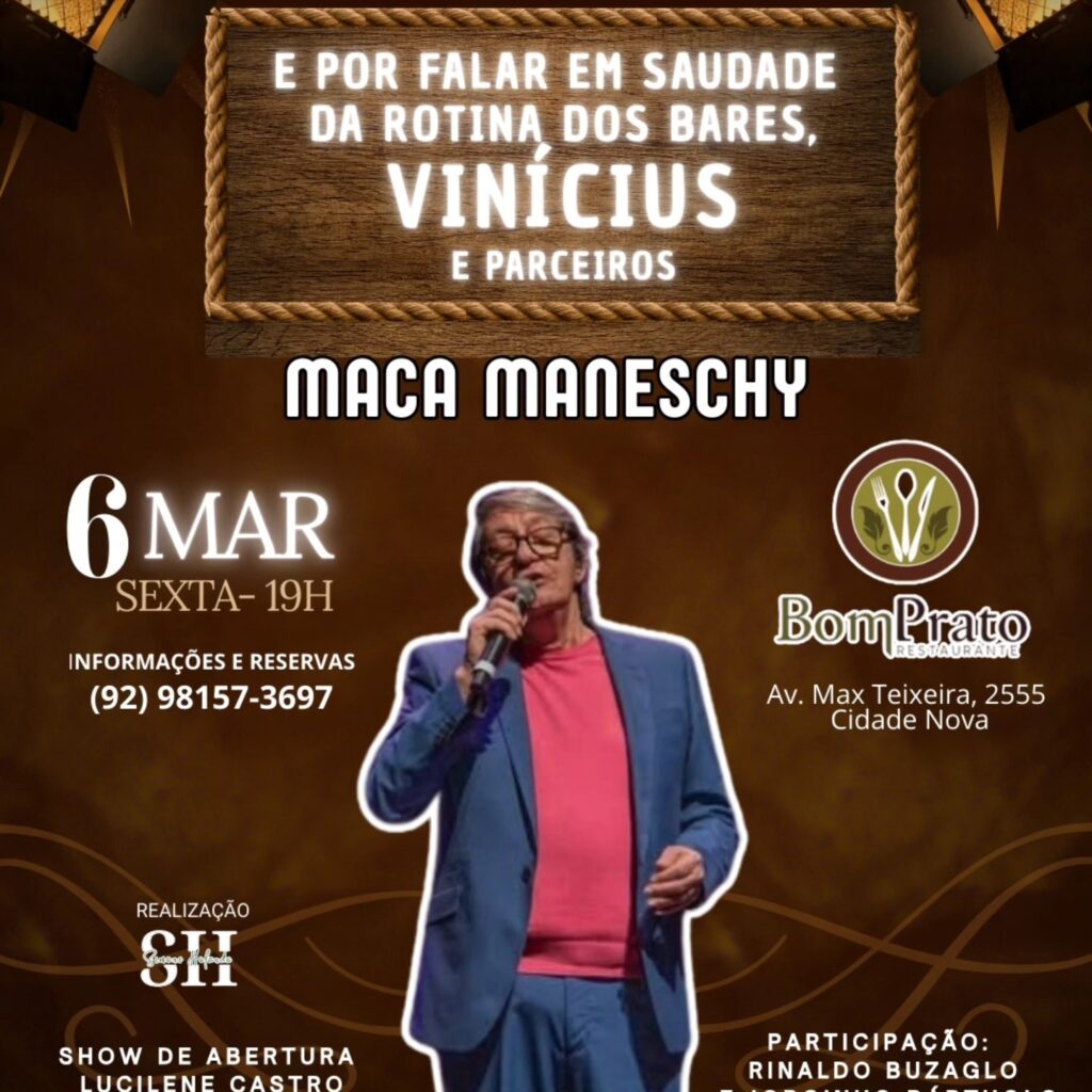 O cantor paraense Maca Maneschy chega a Manaus para uma única apresentação em homenagem a Vinícius de Moraes. O show “E Por Falar em Saudade, da Rotina dos Bares, Vinícius e Parceiros” acontece nesta sexta-feira, 06, no restaurante Bom Prato, a partir das 19h. “Vamos celebrar a obra do nosso eterno poetinha, trazendo à vida suas composições e parcerias com artistas como Toquinho, Tom Jobim e Baden Powell”, afirmou Maneschy.