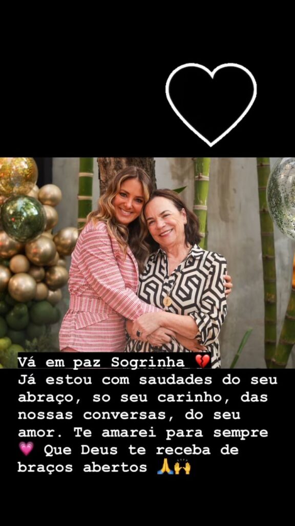 “Vá em paz, sogrinha. Já estou com saudades do seu abraço, do seu carinho, das nossas conversas, do seu amor. Te amarei para sempre. Que Deus te receba de braços abertos”, escreveu a apresentadora no Instagram.