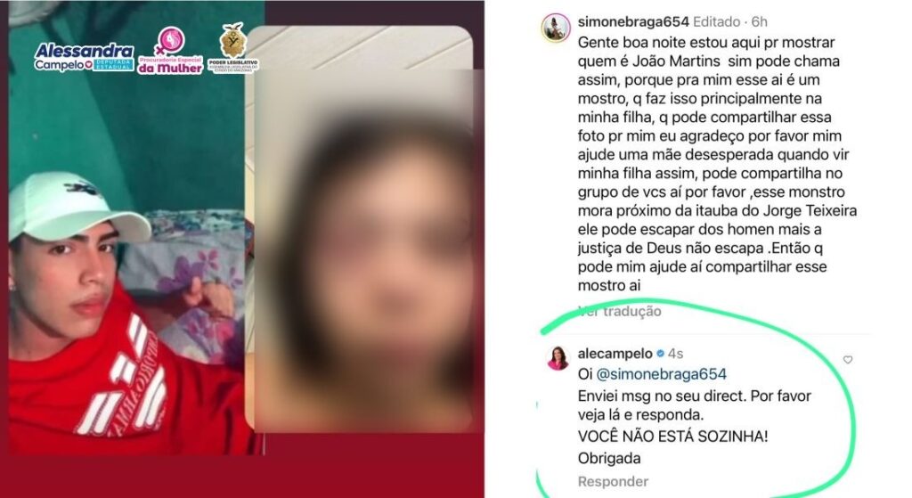 A parlamentar disse que recebeu, em marcação na rede social Instagram, a denúncia da seguidora Simone Braga sobre a agressão de sua filha. A postagem aponta um homem identificado como “João Martins”, que mais tarde foi identificado como João Paulo Pavão dos Santos, como o suposto agressor. A denunciante pede socorro para que o agressor seja preso.