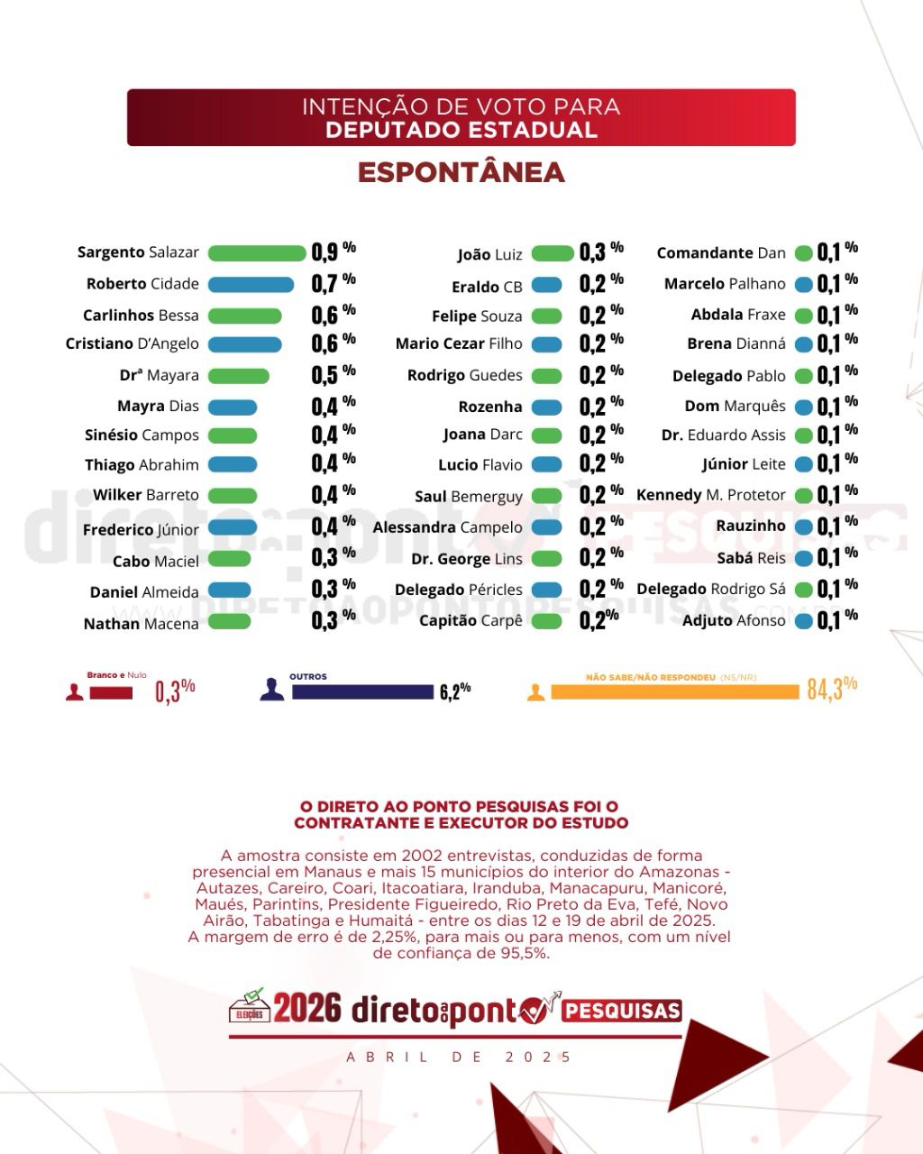 Um levantamento divulgado pelo instituto Direto ao Ponto Pesquisas mostrou que 84,3% dos amazonenses entrevistados não sabe em quem irá votar para deputado estadual nas eleições de 2026. A pesquisa espontânea, quando não são apresentadas opções de candidatos, ouviu 2.002 pessoas em Manaus e em outros 15 municípios do interior do estado.