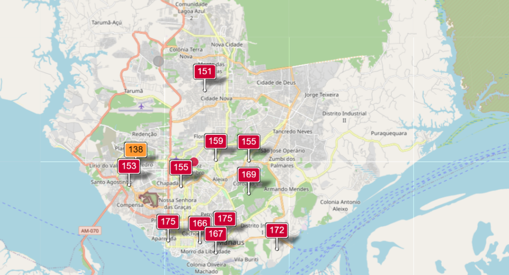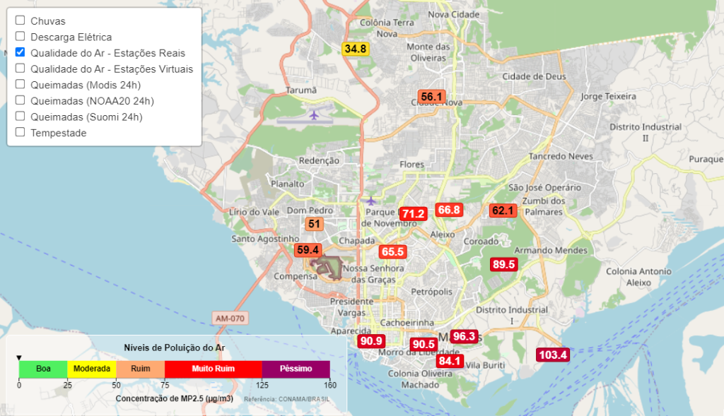O sistema eletrônico de Vigilância Ambiental (Selva) também aponta que a qualidade do ar em Manaus é ‘ruim’ e ‘muito ruim’. Todas as zonas da cidade estão sentindo os efeitos da fumaça nesta sexta-feira (27), como mostra o mapa.