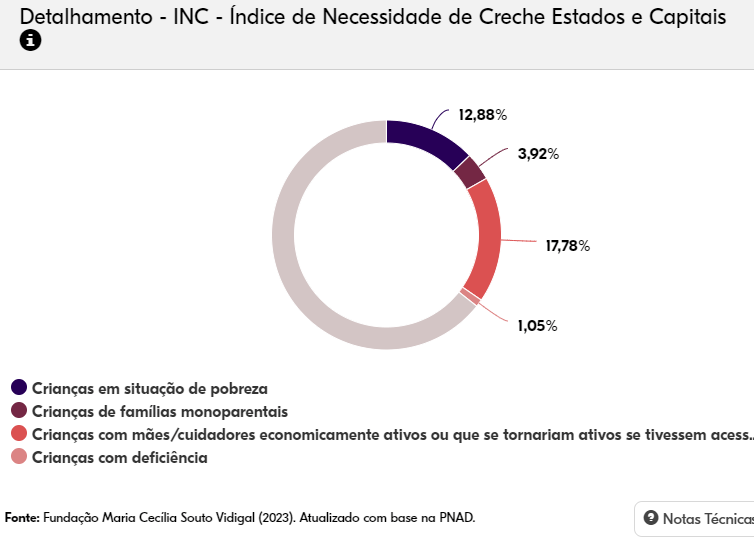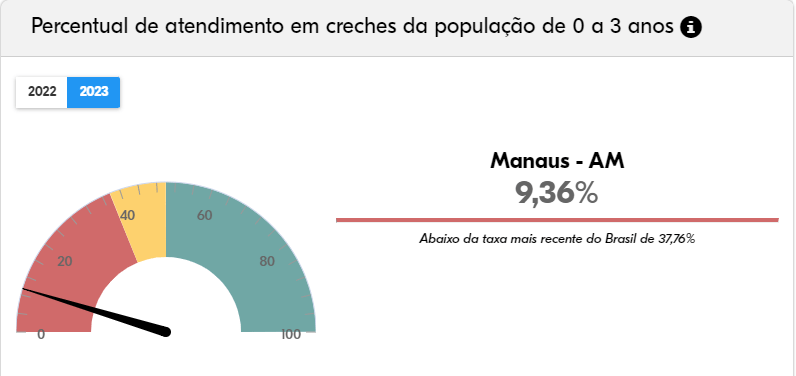 Dados do Índice de Necessidade de Creche Estados e Capitais (INC) referente ao ano de 2023, aponta que a cidade Manaus possui 35,6% de crianças de 0 a 3 anos que estão em grupos considerados mais vulneráveis e deveriam ter o direito à creche priorizado. Já o percentual do Amazonas, englobando os demais municípios é de 42,7%. Em todo o país, são 4,5 milhões de crianças, representando 45,9%. O INC é uma ferramenta criada pela Fundação Maria Cecilia Souto Vidigal, em parceria com a Quantis, para apoiar o planejamento de políticas de acesso a creches.