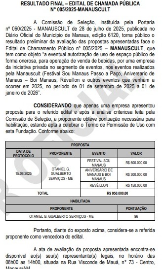 De acordo com o resultado final do edital de chamada pública para “eventual autorização de uso de espaço público” para venda de bebidas pela iniciativa privada, a H20 Eventos, cujo nome social é Otaniel G. Gualberto Serviços – ME, a empresa pagará ao município R$ 500 mil para operar já na próxima semana durante o #SouManaus Passo a Paço 2025. Outros R$ 300 mil serão pagos para que a empresa possa vender bebidas, de forma exclusiva, durante o Boi Manaus 2025, que ocorre em meio às comemorações do aniversário da cidade.